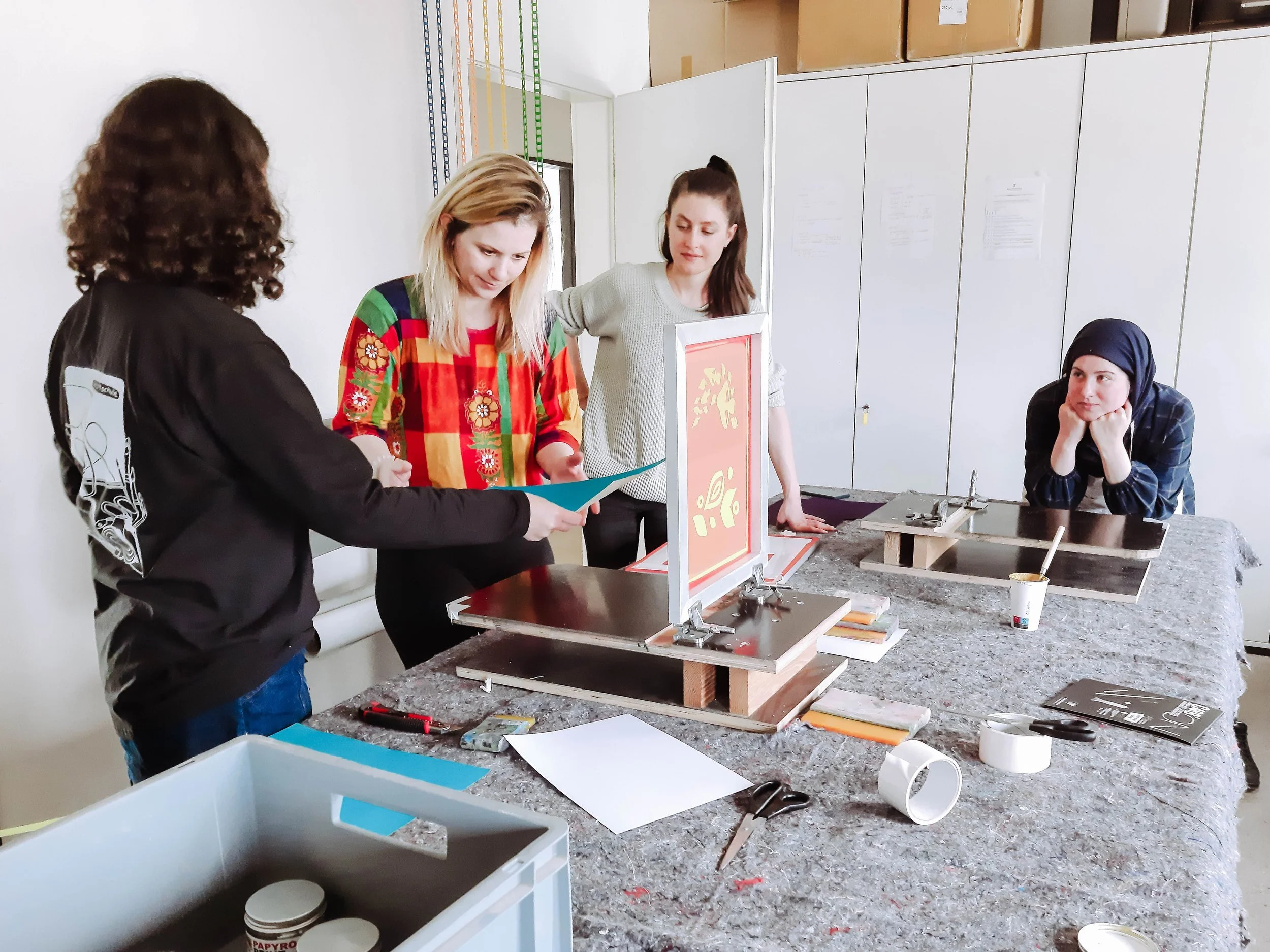“Wir gestalteten und stellten ein Notizbuch selbst her. Dabei lernten die Teilnehmerinnen die Technik des Buchbindens und des Siebdruckens kennen. Zu Beginn entwickelten wir abstrakte Motive, dies waren z.B geometrische Buchstaben oder Formen. Mithilfe von Scheren und Schneidemessern schnitten wir unsere Motive aus schwarzem Karton aus. Für den Siebdruck belichteten wir die Motive in der Dunkelkammer auf Siebe und bereiteten sie vor. Anschließend druckten wir gemeinsam unsere Motive auf verschiedene farbige Leinenbezüge (Notizbuchcover). Zum Schluss lernten die Teilnehmerinnen, wie sie aus deinem bedrucktem Leinenbezug, Pappe, Papier und Leim ein eigenes Notizbuch herstellen.”